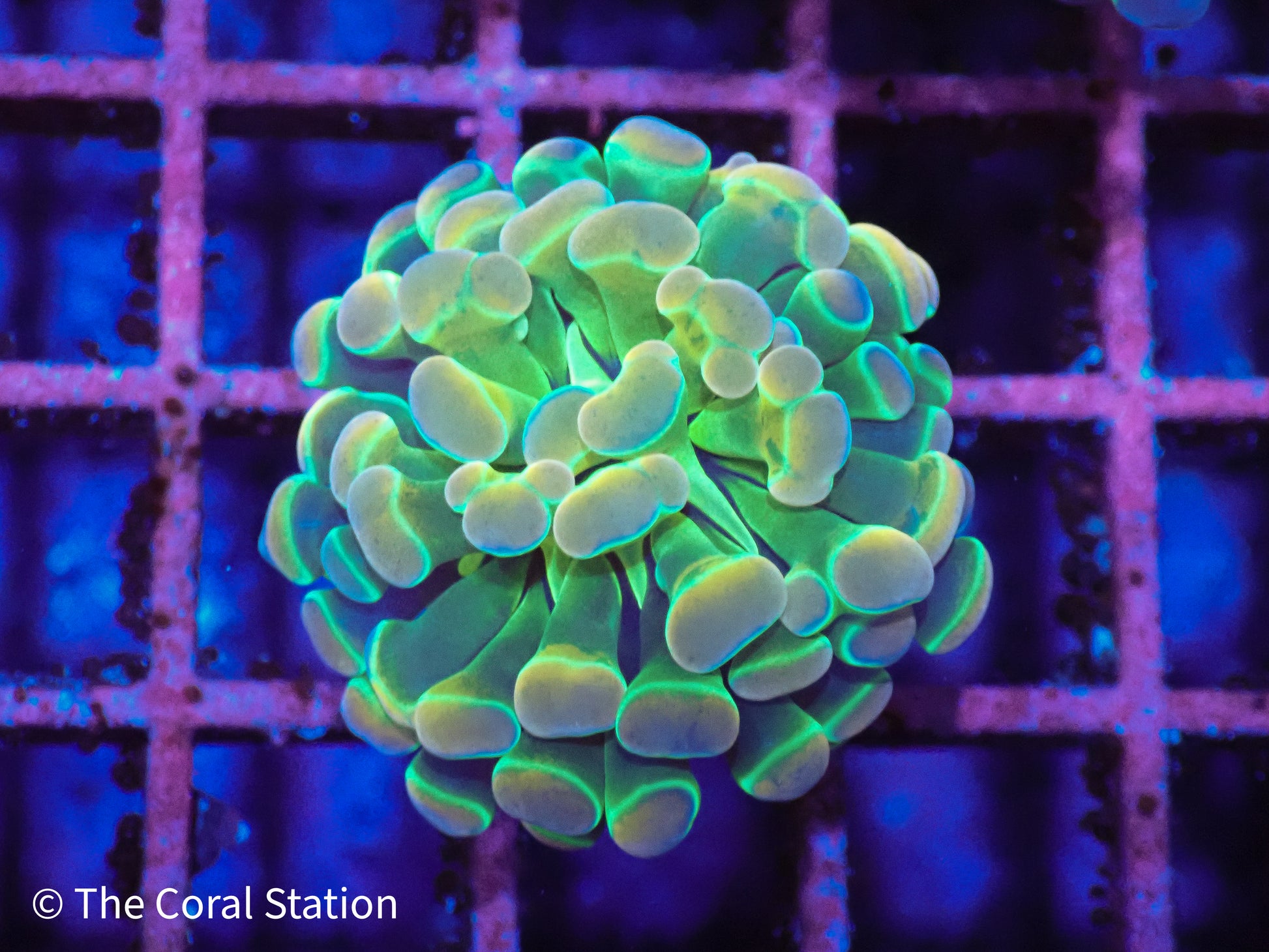 Light up your reef tank with the stunning Hologram Hammer. This branching LPS coral features thick hammer-shaped tentacles with a fluorescent green base and blue tips that glow beautifully under actinic or LED reef lighting.